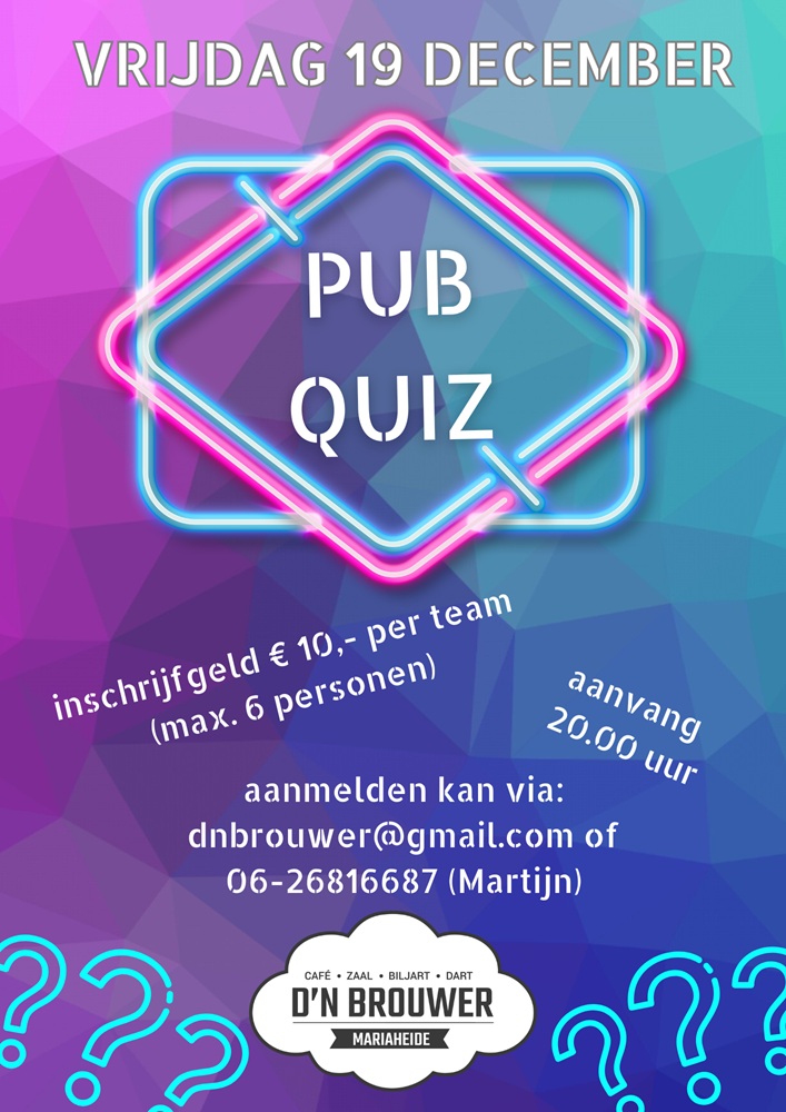 Vrijdag 19 december organiseert café D'n Brouwer in Mariaheide weer een gezellige pubquiz. Opgeven van een team (maximaal 6 personen) kan via Martijn Brouwers (0626816687 of dnbrouwer@gmail.com). Inschrijfgeld is € 10,- per team. Aanvang is deze keer weer om 20.00 uur dus zorg dat je op tijd aanwezig bent.